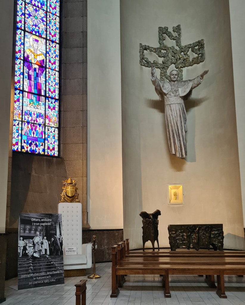 Our trip to the city of Katowice was a day later than we’d planned. Smugly turning up at the train station expecting to be able to get a ticket, we found that all the trains we wanted were fully booked. Instead we travelled on the Feast of the Assumption of Mary, a public holiday when pretty much every public building and shop is shut. Not the best timing. We caught the tail end of mass at the largest cathedral in Poland which, in a country brimming with churches, that’s quite an accolade. Mhairi has often said to me, “Gerry, size isn’t everything.” and that’s always embarrassed me because I’d never really understood what she meant. I realise now it refers to cathedrals – doh! And she has an excellent point. After the intricate beauty of Karkow’s smaller churches, this cathedral feels dull despite its exceptional size.