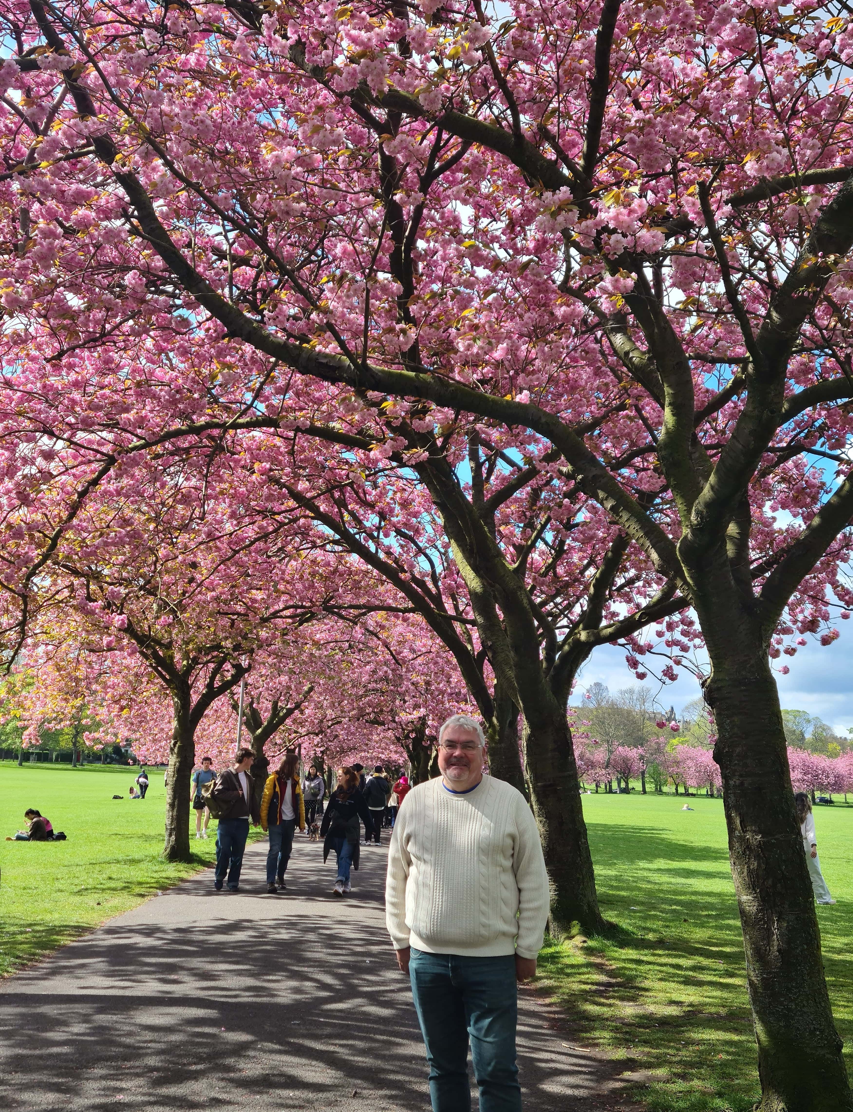 Everytime we’re back near Edinburgh, we get a haircut. You can tell from our photos that Gerry is happy to take a chance with a barber in Malaysia or wherever but Mhairi is more sensible. While we were in the city, we thought we would walk past the castle, the Scott monument and St Giles’ catherdral to go and see the blossom in the Meadows alongside the crowds of Japanese tourists. As we watched them take their photos, it was obvious that our posing skills are seriously below par!