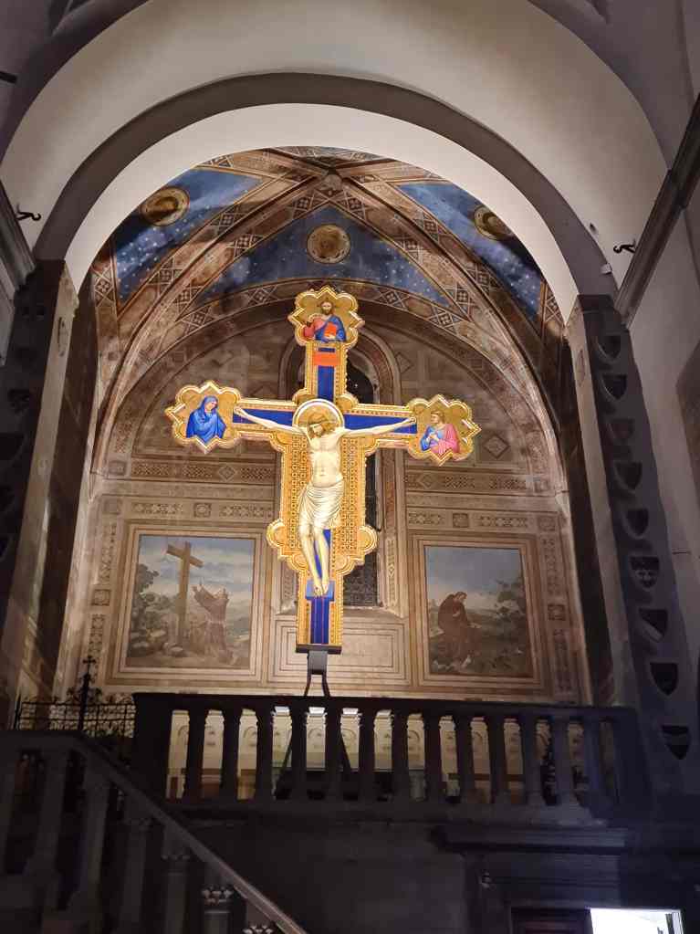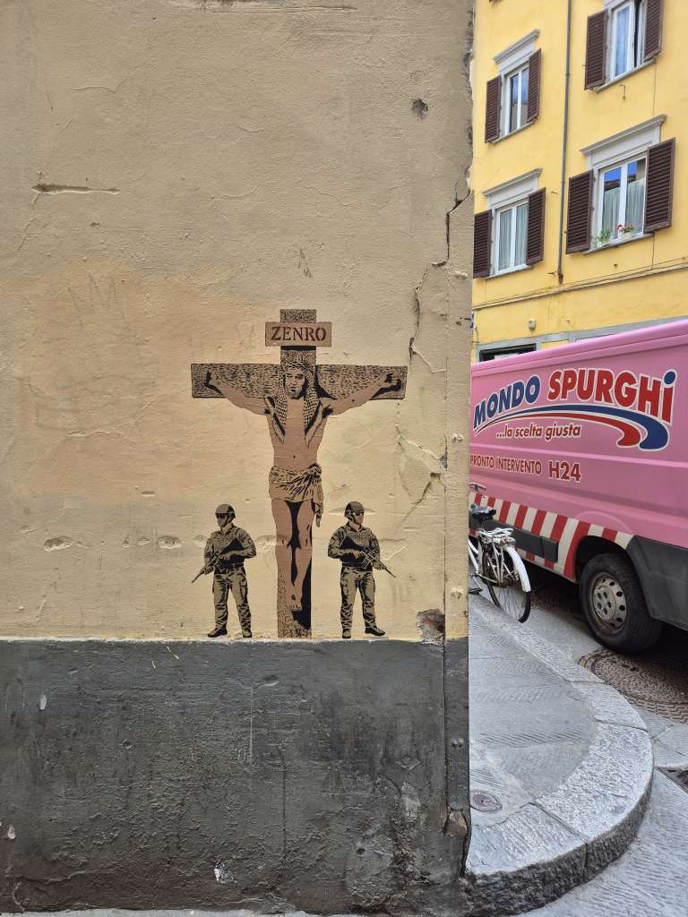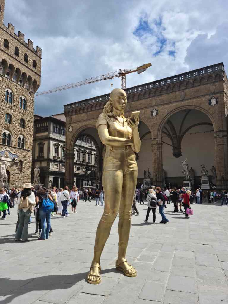 The first church we came across while wandering in Florence – il Chiesa di San Salvatore in Ognissanti – was a stunning place of art and devotion , including a crucifix by Giotti dating back to 1315. The city is overflowing with statues, paintings, architecture, frescos and murals. Poor Perseus has to stand outside the Uffizi Gallery as if there is no room left inside and he has to survive as best he can on the street. Fortunately, modern day art is also thriving in Florence such as the mural by street artist Zenro (above) and the statue of”Time unfolding“, which must be the only smartphone in Florence not taking a photo of something!