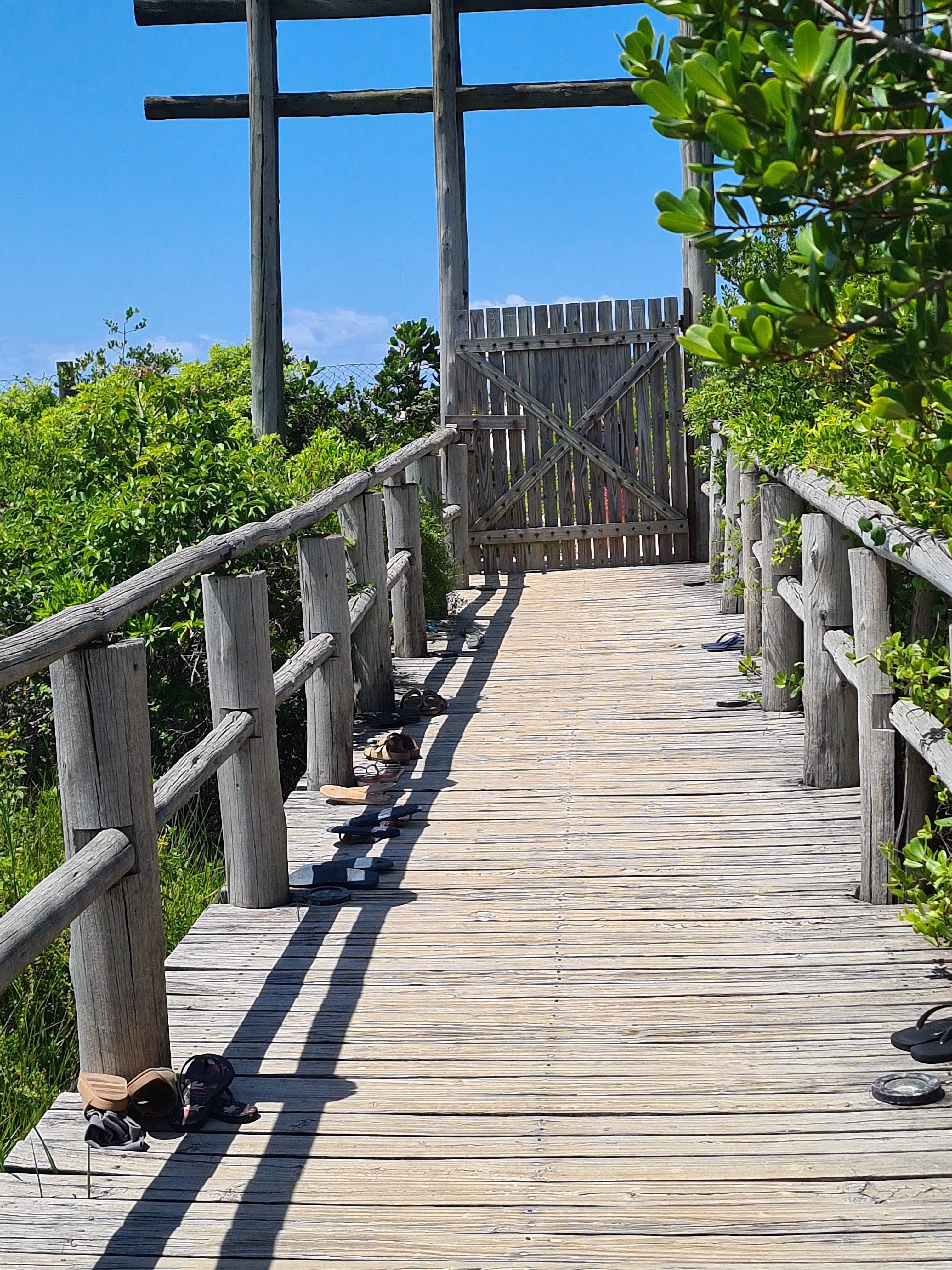 There were loads of exotic (to us) birds flying around and we even saw a whole family of marmosets. And very cute they were too. We were tickled that everybody left their sandals just lying on the boardwalk before heading on to the sand and not to feel left out, we joined in.