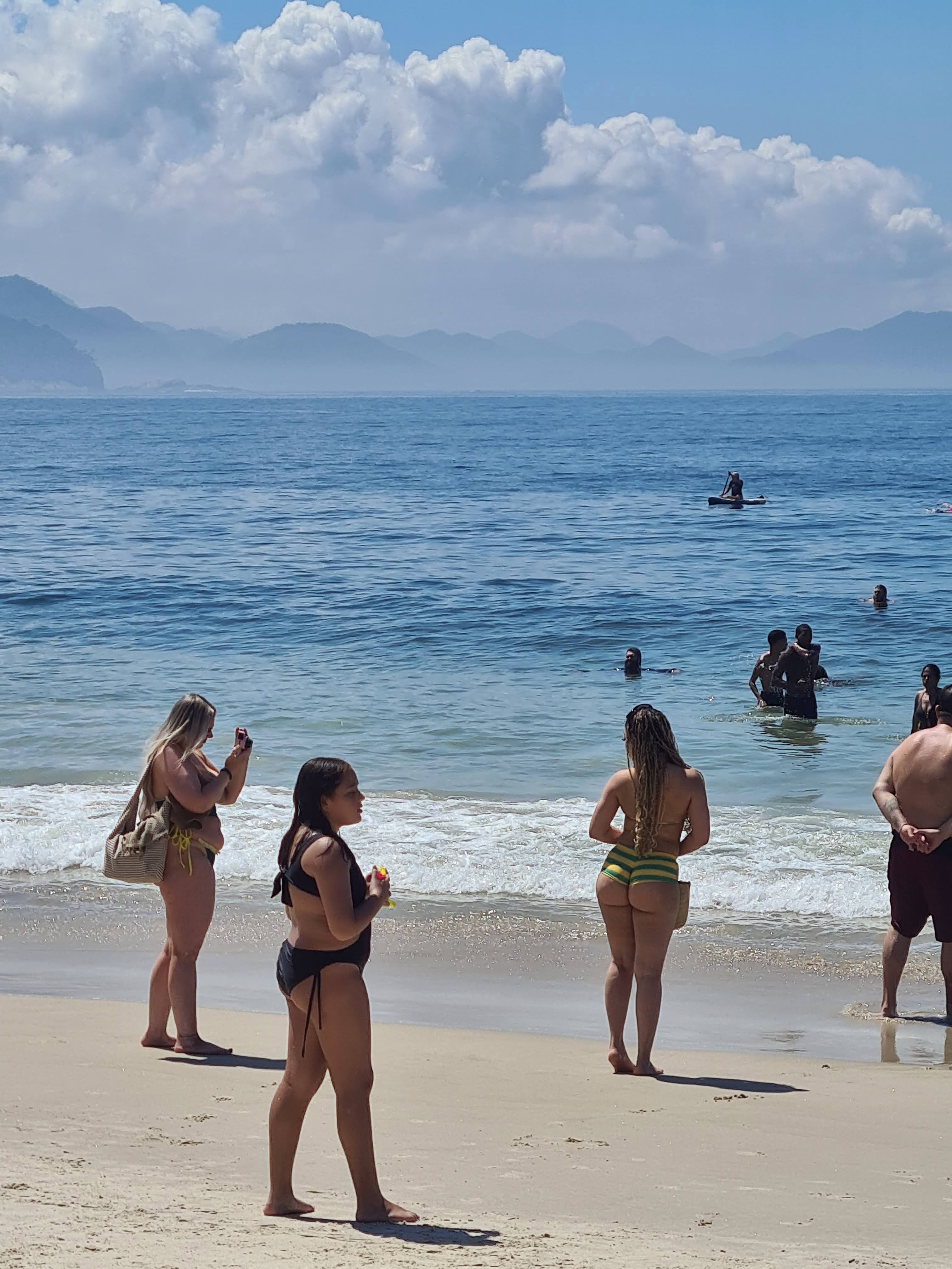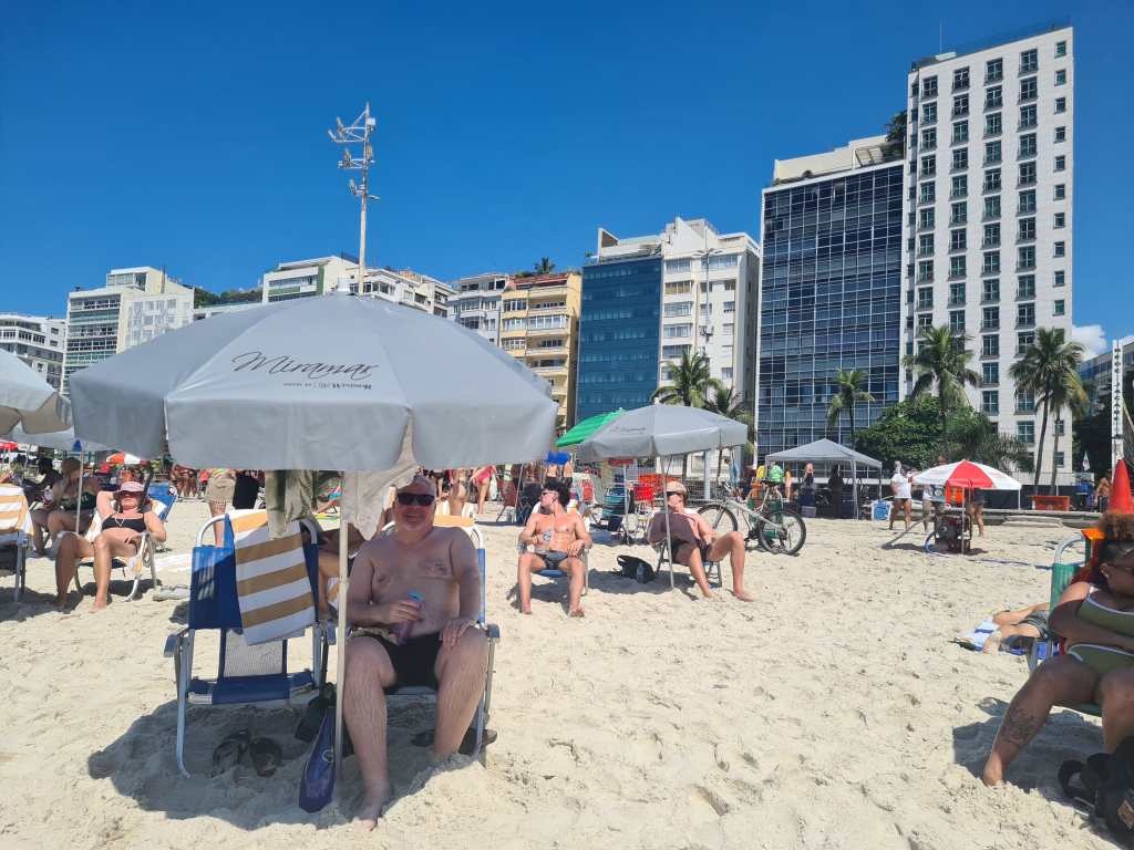 The hotel had a desk at the door to provide beach towels and a gazebo on the beach where we could get an umbrella and deckchairs. We settled down with some cocktails purchased from one of the many beach vendors and watched the show that is Copacabana beach. I’m not sure what Copacabana means exactly but it wouldn’t surprise me if it was “land of the bum-cheek”. A great multitude were on display in all shapes and sizes and old age was no barrier.
